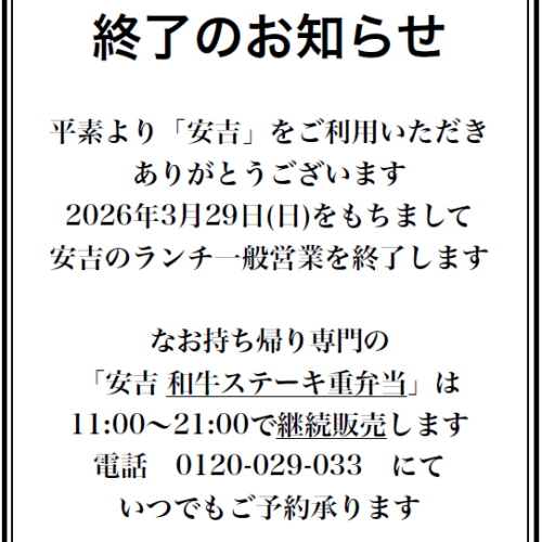 安吉「ランチ営業終了のお知らせ」及び「ディナー休業のお知らせ」